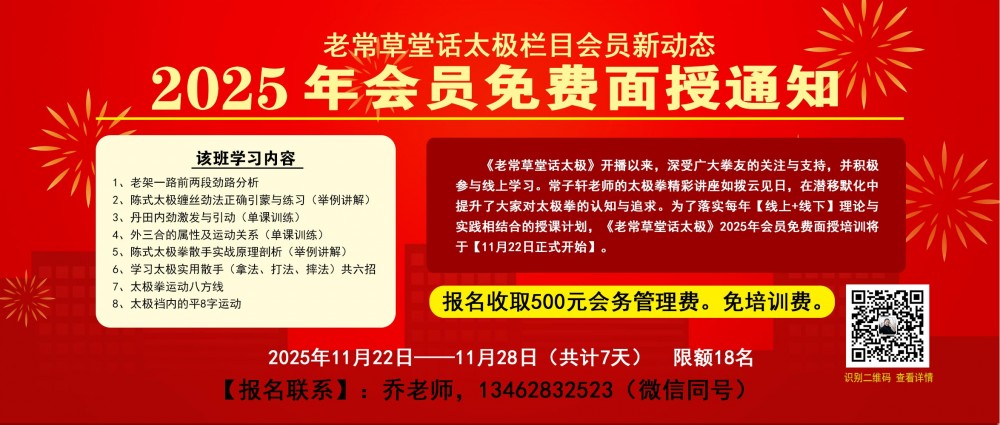 线上学习,线下面授提高,为了让拳友们能更好的理论与实践相结合,提高太极拳技艺,《老常草堂话太极》2025年会员免费面授培训将于11月22日正式开班。
