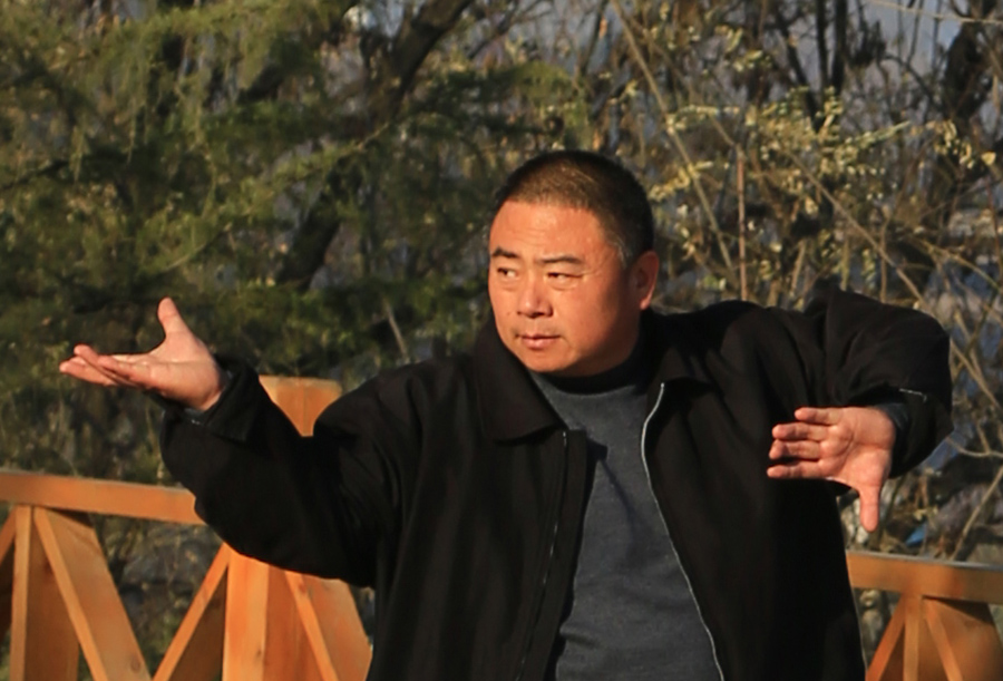 为什么是命门穴以下呢?顶劲就是胸、肩、胯仍然是松沉的,但它分段是从命门穴开始分的,然后将肩背这一块交给头顶,但它与头顶相对而言也是依次松沉的,只是从命门穴往下开始断开。命门穴往下松的话,我们的身体就会出现上盘和下盘,这样的话,命门穴以下往下松的时候,我们就知道开始分段了,就是肩上边与胯相应,这就分上下了。肘与膝相合,手与脚相合,这样从命门穴以下放松的时候胯是松的,如此就找到了上盘与下盘,上边是清气,下边是浊气。这样在打太极拳的时候我们就能感受到它是沉稳的,该缠丝的时候就是缠丝。